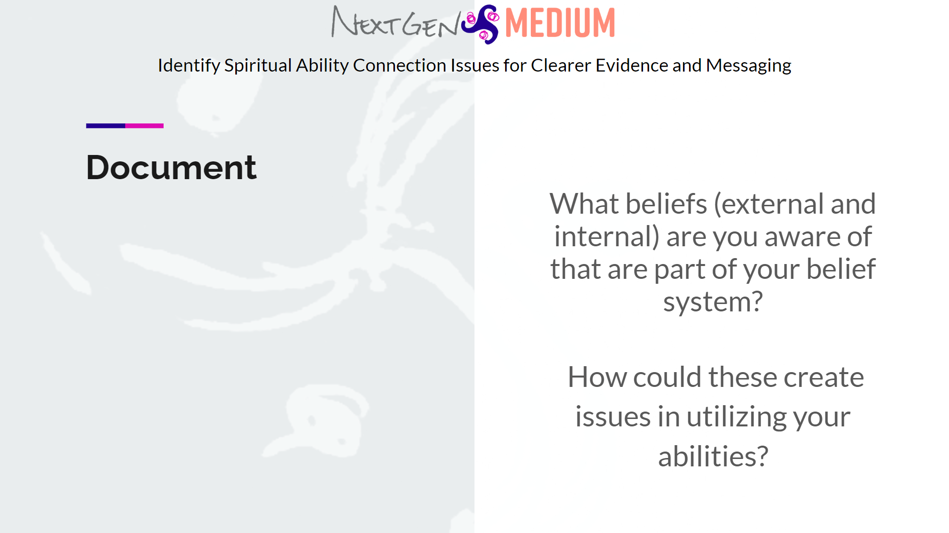 Progress NextGEN Medium Soul Abilities Discovery Workshop Complete & Continue Next Lesson Learn More Let's Start Your Exploration! 6 Lessons Soul Abilities Discovery Workshop Introduction NextGEN Medium Terms and Conditions for this Workshop About Your Instructor Workshop Objectives and What to Expect As You Begin Your Journey Life Changes Utilizing The Soul Mode Tools Discover the Soul Mode Ability (Psychic, Medium, Intuitive, and Healing) That Is The Best Fit For You 20 Lessons Course Overview 🔎Assessment: Start Witnessing Your Soul Abilities At Work 📝 Journaling Time: Explore Your Soul Ability Mode Result Moving Forward After You've Been Matched Soul Ability Modes Overview Intuition Overview Intuition Details 📝 Journaling Time: Reflect on Past Intuition Experiences Psychic Ability Overview Psychic Ability Details 📝 Journaling Time: Reflect on Past Psychic Experiences Mediumship Ability Overview Mediumship Details 📝 Journaling Time: Reflect on Past Mediumship Experiences Healing Overview Healing Details 📝 Journaling Time: Reflect on Past Healing Experiences 📝 Journaling Time: Pick A Mode That Interests You ➕More Resources On Soul Modes 💬 Student Feedback Essentials to Work Your Spiritual Abilities for Undeniable Evidence 21 Lessons Course Overview Essential External Tools Overview The Essential Tool of Meditation How to Meditate Meditative Activities 👁️🗨️ EXERCISE: Meditation To Experience Your Abilities & Senses 📝 Journaling Time: Reflect on Meditation Experience The Essential Tool of Journaling The Essential Tool of People Essential Internal Tools Overview The Essential Tools of the Soul Senses (A.K.A. The Clairs) 📝 Journaling Time: Reflect On Your Clair Experiences 🔎 ASSESSMENT: Which Clair Is Your Super Soul Sense? Moving Forward with the Soul Senses for Your Development The Essential Tool of Awareness The Essential Tool of Imagination The Essential Tool of Intuition The Essential Tool of Intention The Essential Tool of Curiosity ➕More Resources On The Subjects Brought Up In This Section 💬 Student Feedback Identify Spiritual Ability Connection Issues for Clearer Evidence and Messaging 18 Lessons Course Overview 📝 Journaling Time: Reflect on Current Barriers So Far The Ego Egoic Barriers Identifying Your Egoic Barriers Coping With Shame 📝 Journaling Time: Reflect On Your Egoic Barriers Beliefs 📝 Journaling Time: Reflect on Presence of Beliefs What Is Mindset? A Visual of Mindset 📝 Journaling Time: Reflect On Your Mindset Identifying Your Vibe 🔎 ASSESSMENT: How Aligned Are You With Your Spiritual Higher Self? Vibe Visual How to Work With Your Wack ➕More Resources On The Subjects Brought Up In This Section 💬 Student Feedback Shift Your Soul Abilities Development Into A New Reality 24 Lessons Course Overview Technique for Connecting Connecting: Settle Down Connecting: Settling In Connecting: Opening Up Connecting: Observe and Explore Connecting: Wrap Up & Document External Energetic Tools Overview Energetic Tool of Music Energetic Tool of Scent Energetic Tool of A Dedicated Space Energetic Tool of Crystals and Stones Messaging Tool of Divination 🔎 ASSESSSMENT: Which Divination Practice Would Be the Most Effective For Your Spiritual Ability Growth? Messaging Tool of People Tune-In Improvement Practice Overview Tune-in Improvement Practice: Do Things You Want To Do Tune-in Improvement Practice: Use Your Imagination Tune-in Improvement Practice: Practice Free-flow Activities Tune-in Improvement Practice: Meditation Exercise Set Expectations For Yourself And Your Clients Legal And Ethical Things To Know Before Doing Readings ➕More Resources On The Subjects Brought Up In This Section 💬 Student Feedback Moving Beyond This Workshop With Your New Knowledge 6 Lessons Final Words As You Continue Your Journey ➕More Resources Based on Information from This Workshop Add A Review of This Course 💬 Workshop Feedback Connect with NextGEN Medium Student Discounts NextGEN Medium Soul Abilities Discovery Workshop Complete & Continue Next Lesson Learn More Identify Spiritual Ability Connection Issues for Clearer Evidence and Messaging 📝 Journaling Time: Reflect on Presence of Beliefs